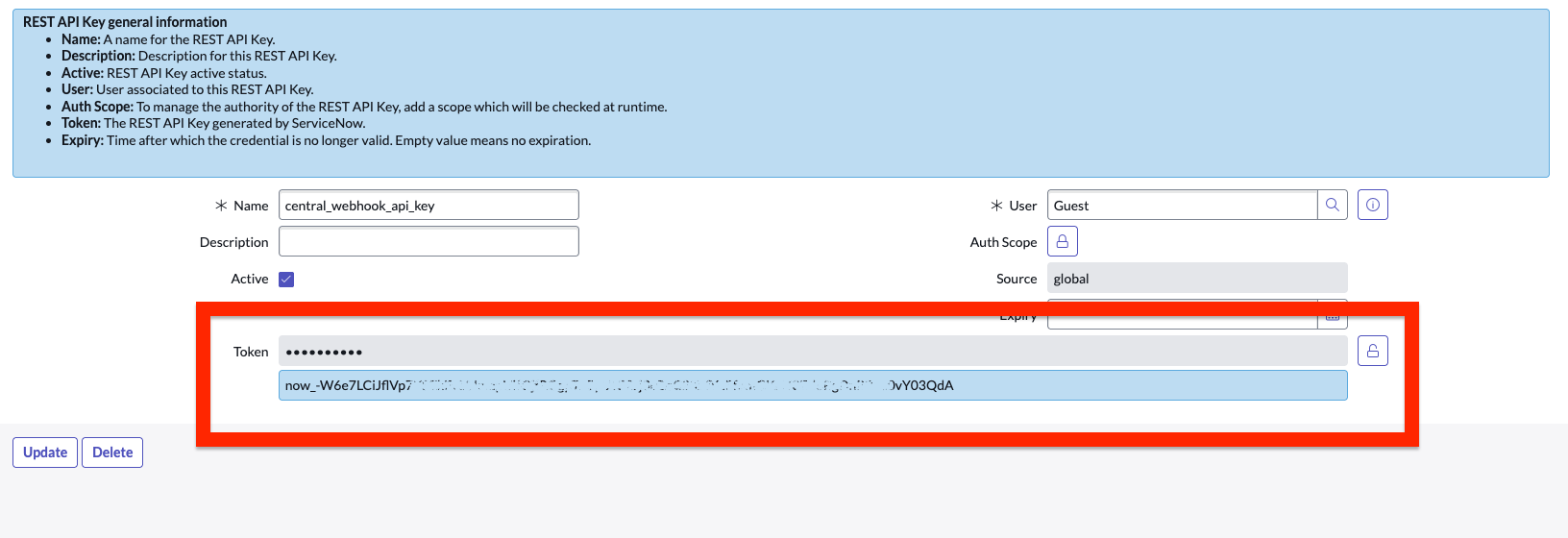 Authorization: - Once you've completed creating an API Key, copy the resulting token provided, this will be the API Key you define when Creating a Central Webhook :