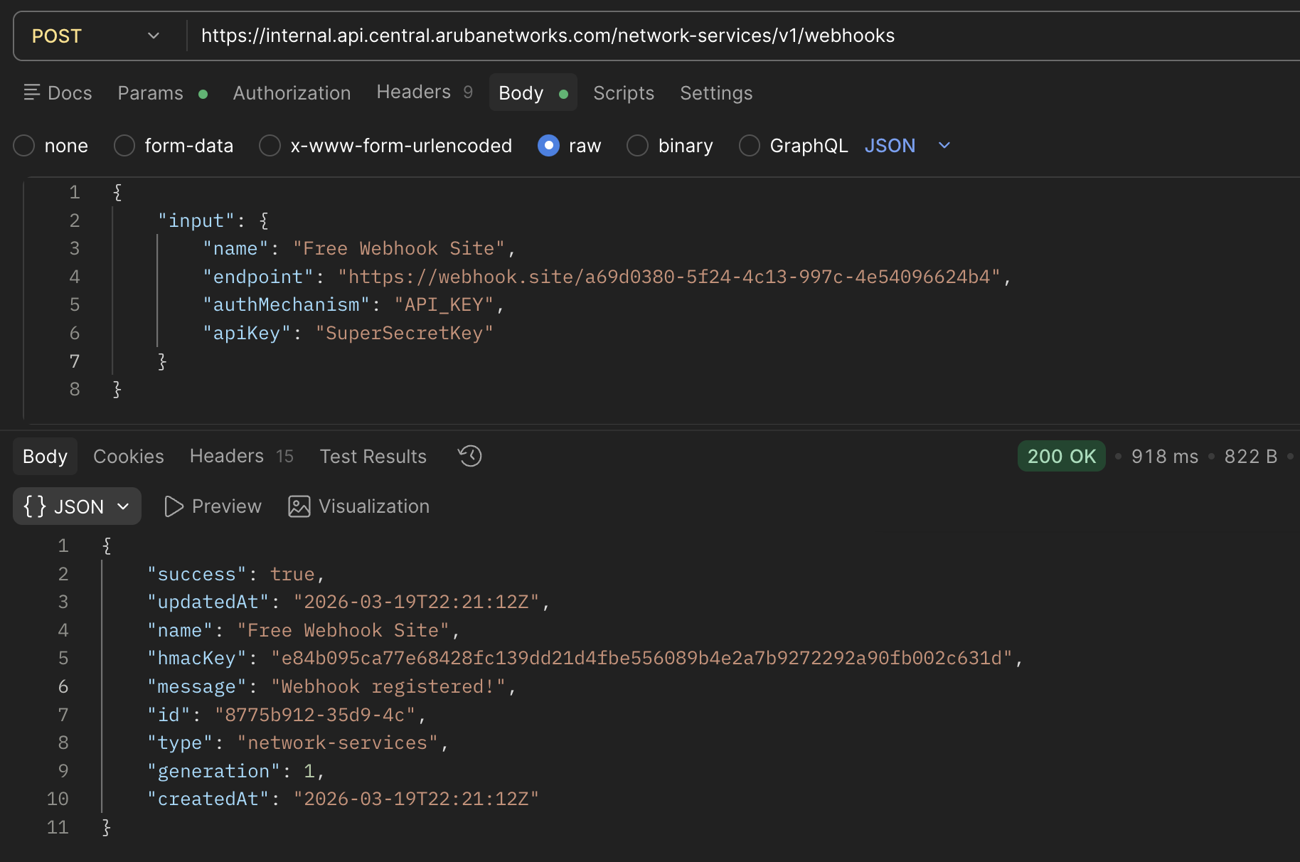 Below is an example on how to create a Webhook using Central's Create a Webhook API :