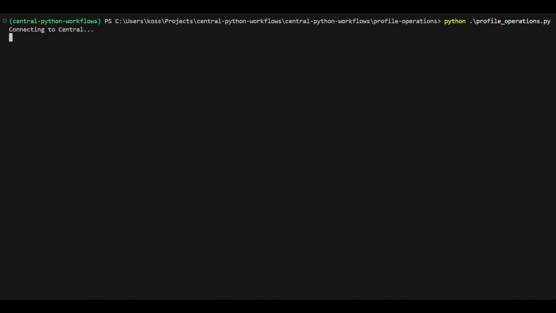 This workflow demonstrates how to use the PyCentral library to manage Central library profiles. It covers creating, reading, updating, and deleting configuration profiles through Central API handled by PyCentral. The workflow focuses on performing example operations for both individual and bulk library profiles.
