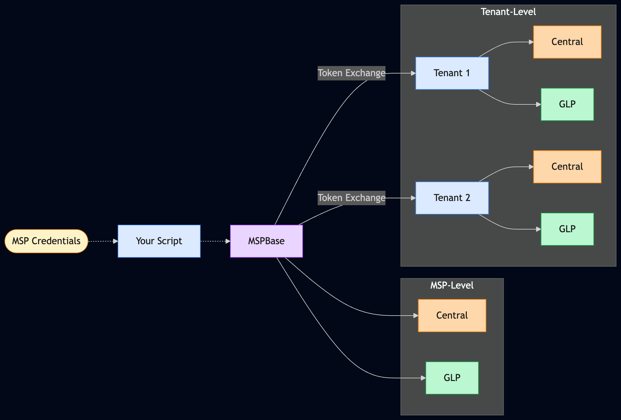 MSPBase WorksMSPBase extends NewCentralBase, PyCentral's connection class for New Central and GLP APIs, adding MSP-specific token exchange and tenant management on top. When you instantiate it, the SDK generates an MSP-scoped token from your credentials. From that point, it manages the full token lifecycle automatically.