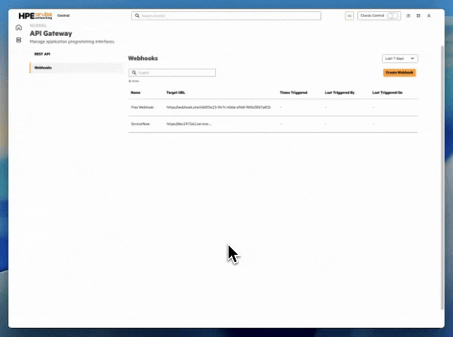 HPE Aruba Networking Central Webhooks provides multiple authentication methods to ensure secure communication between Central and your application. This includes authenticating your application to receive Webhook events and validating the authenticity and integrity of messages being sent from Central.