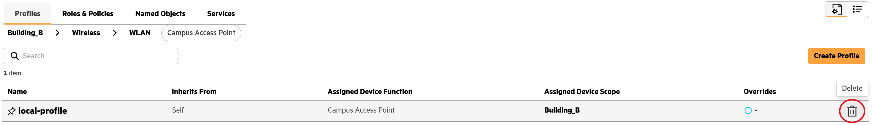 Deleting local profiles comes with some caveats and distinctions depending how it's done and at what scope level. A local profile can only be deleted at the scope level where it was created. For example, if a local profile has been created at the site level, you cannot delete it at the device level of a device in that site. You must delete it at the source scope denoted by the 'Assigned Device Scope' value. However, if a profile is overridden at any level the assignment/inheritance from the source profile will break. This means that you would be able to delete the new local profile normally from the scope level despite the profile originally being assigned/inherited form another source.