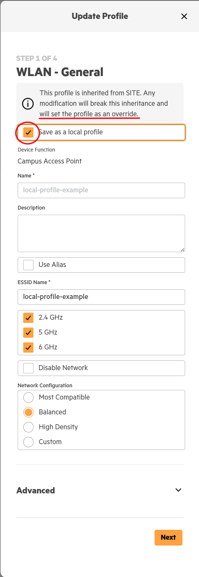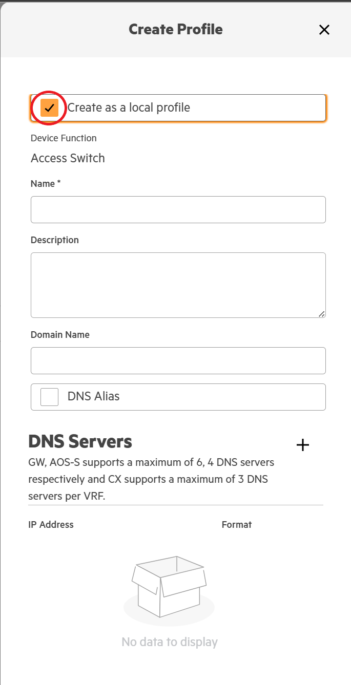 Local profiles can be created at any scope level in the Central UI or through API. Local profiles can be created with the UI as a brand new profile through the create profile flow, or from an existing inherited profile as an override. Local profiles can also be created using the API which requires a device function and a scope ID for your profile. The scope ID designates where the profile will be applied to.