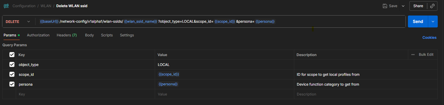 Deleting is just like with the Central UI, you must use the scope ID where the local profile was originally created. For example if you try to delete an inherited profile at the device level that was created as a local profile at the site level you will get a 400 bad request error.