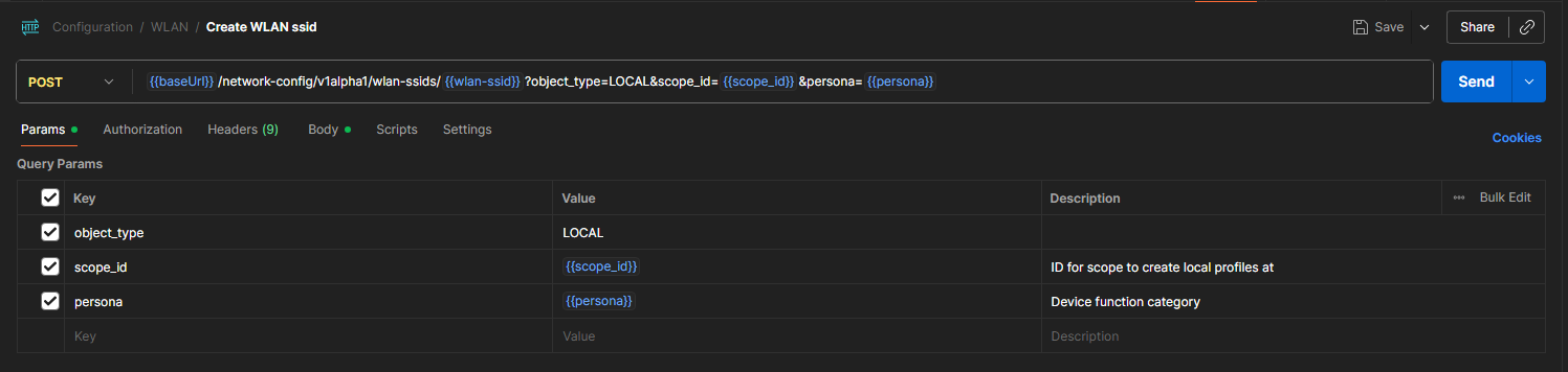 The 'object_type' parameter is always 'LOCAL'. To get the scope ID for where we want to create the local profile please reference our Scope ID guide for full details on this process. The persona is equivalent to the device function from the Central UI. Here is a table with device functions and their persona equivalent: